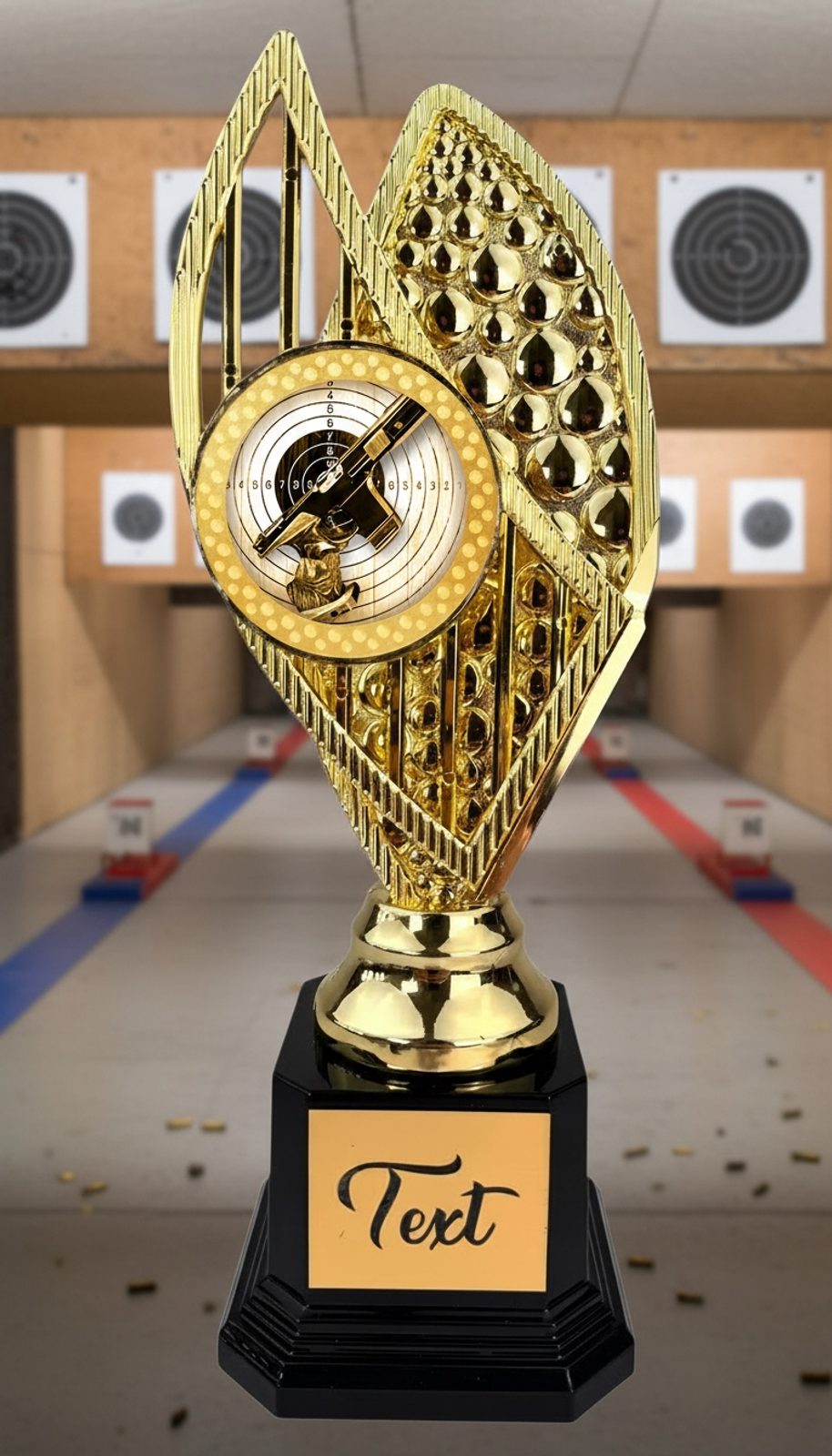 Stilvolle Trophäe in den Farben Gold, Silber oder Bronze, Höhe 31 cm. Design-Emblem mit Sportmotiv in höchster Druckqualität mit Lackierung. Möglichkeit zur Ergänzung eines Schildes nach Ihrer Wahl.