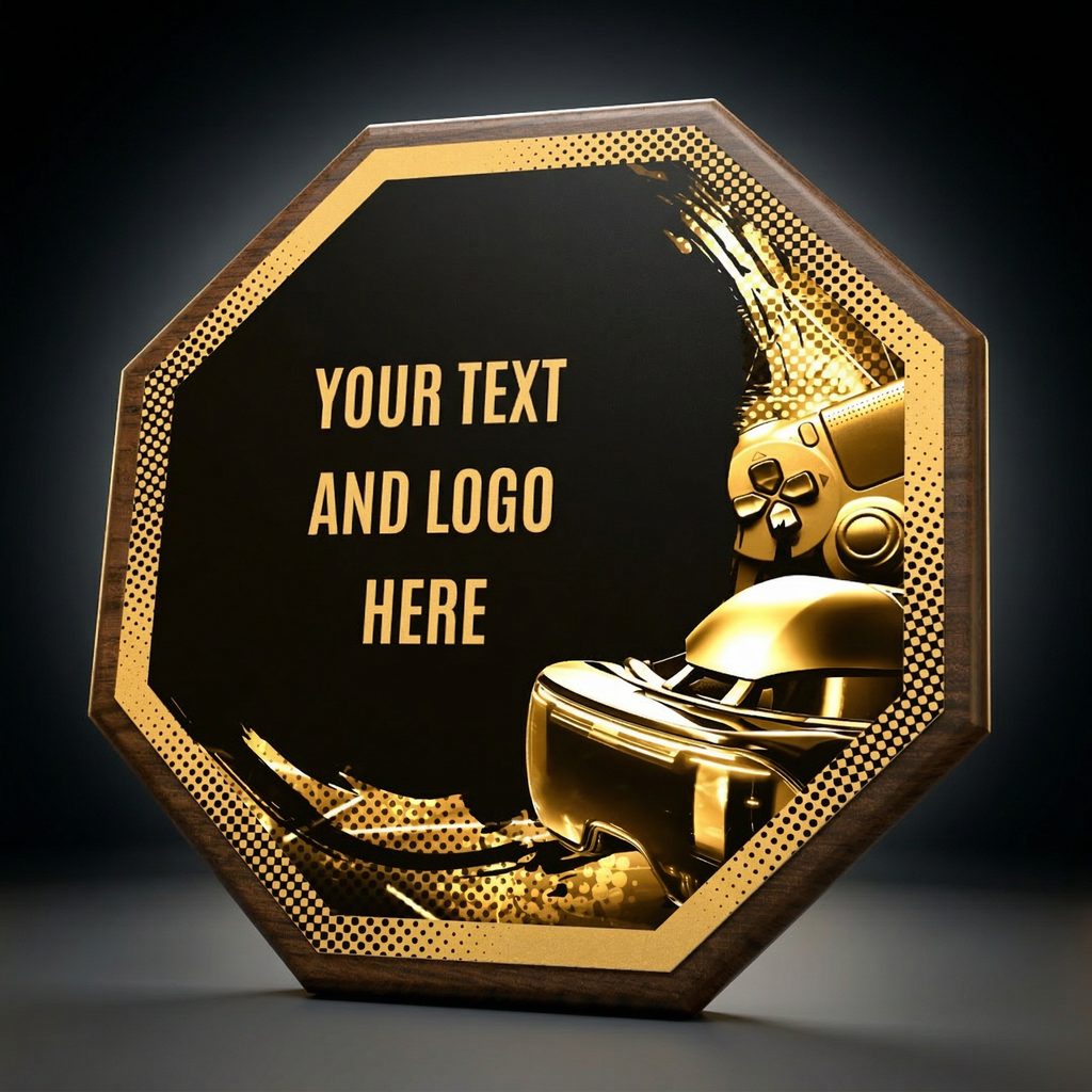 Eine stilvolle Auszeichnung, die eine Holzplakette mit einem Durchmesser von 26 cm und einer Stärke von 1,5 cm mit einem markanten Design-Zentrum (Durchmesser 24 cm) aus Metall kombiniert, veredelt mit UV-Druck und Effektlack.