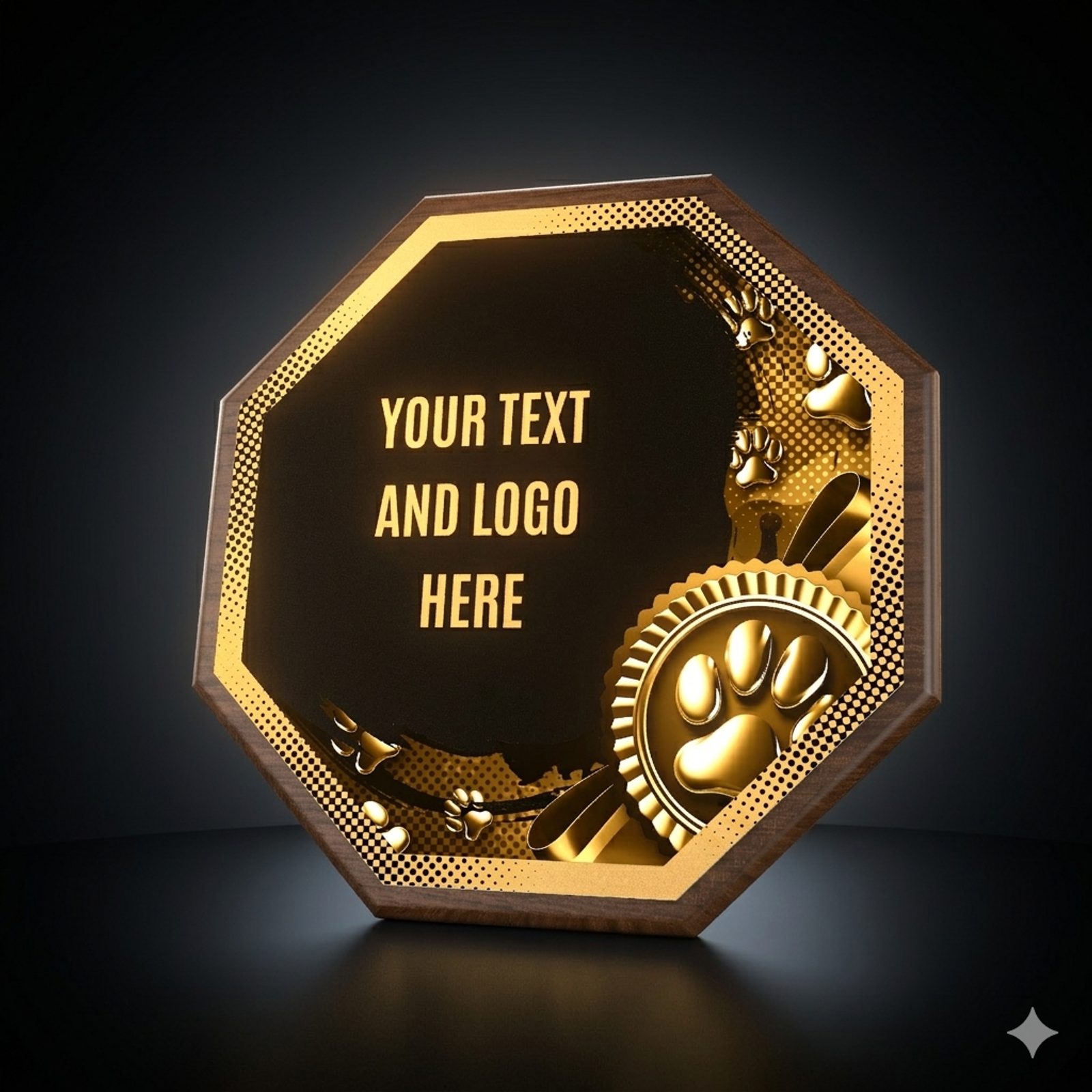 Eine stilvolle Auszeichnung, die eine Holzplakette mit einem Durchmesser von 26 cm und einer Stärke von 1,5 cm mit einem markanten Design-Zentrum (Durchmesser 24 cm) aus Metall kombiniert, veredelt mit UV-Druck und Effektlack.