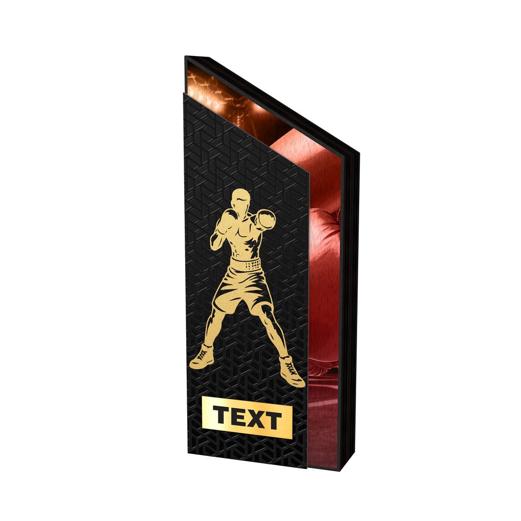 Sporttrophäe aus hochwertigem Holz mit einer Stärke von 3 cm und einem Edelstahlelement mit einer Stärke von 2 mm, erhältlich in drei Höhen und vier Farbvarianten. Im unteren Teil kann ein Kunststoff- oder Metallschild angebracht werden.
